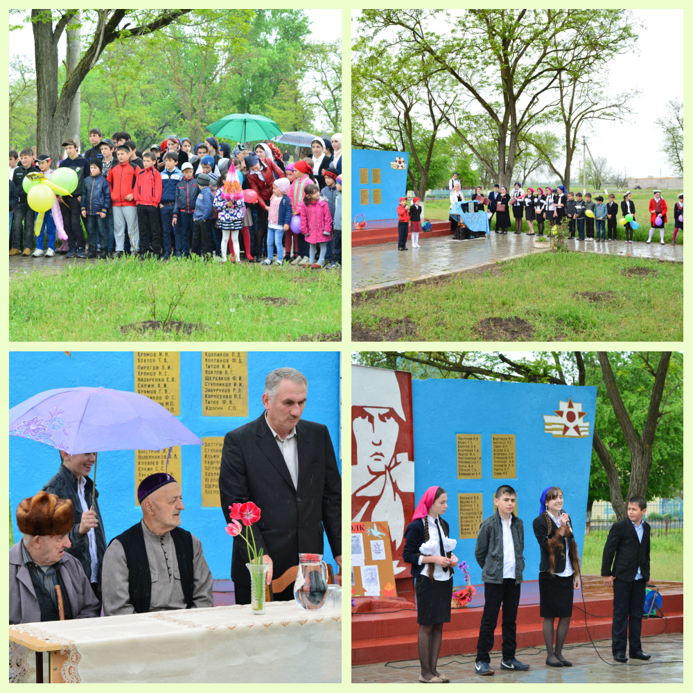 9 мая 2015г. у обелиска прошел митинг, во время которого учащиеся представили литературно-музыкальную композицию «Их подвиг вечен в памяти людской», подготовленное учителем русского языка и литературы Бачаевой З.Б.и учителем начальных классов Тисаевой Л.С.. Со словами поздравлений к присутствующим обратился Глава администрации села Яхиев С., директор школы Амирова П.Х., житель села Юсупов С. Звучали песни военных лет. Знаменитые «Смуглянка», «Катюша», «День Победы» и др. До глубины души тронуло всех присутствующих стихотворение Мусы Джалиля «Варварство» в исполнение ученицы 7 а класса Юсуповой Хавы. Несмотря на дождь никто из присутствующих не хотел уходить. Это мероприятие позволило учащимся еще раз вспомнить о героизме советских людей в годы Великой Отечественной войны соприкоснуться с их подвигом. Группа детей вместе с педагогом – организатором Умаевым К.А. приняли участие в районном шествии «Бессмертный полк» с портретами наших односельчан участников войны.