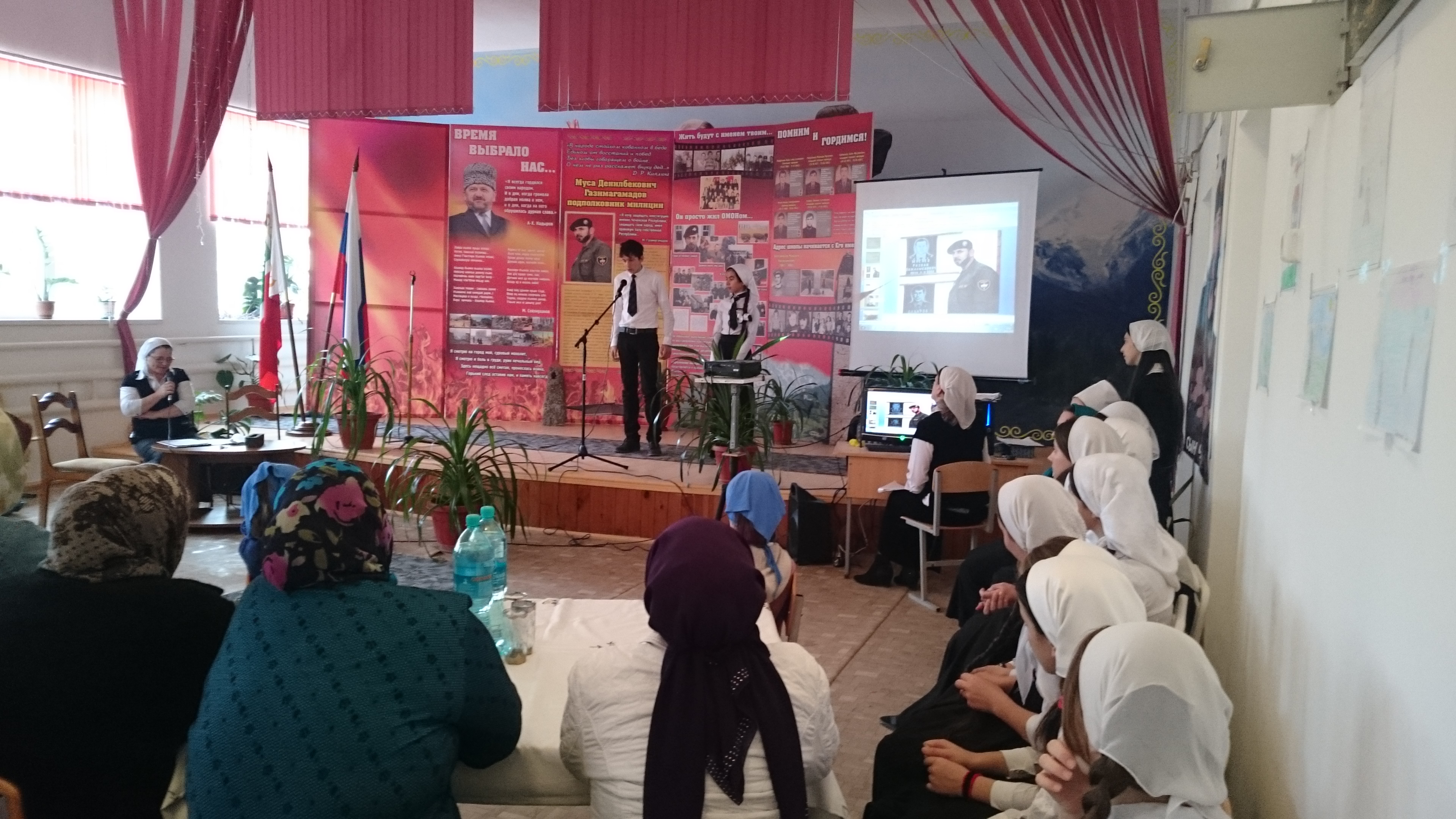 Заместитель директора по ВР и организатор школы приготовили литературно-музыкальную композицию «Время выбрало нас». Звучали песни и стихи о героях, любви к Родине. Мероприятие получилось очень эмоциональным и произвело большое впечатление на всех присутствующих. После завершения праздника был прочитан мовлид.